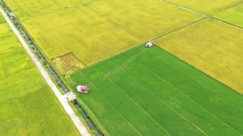 8月22日,在湖南省永州市道县营江大街,农机手驾驭机械收割水稻(无人机相片)。