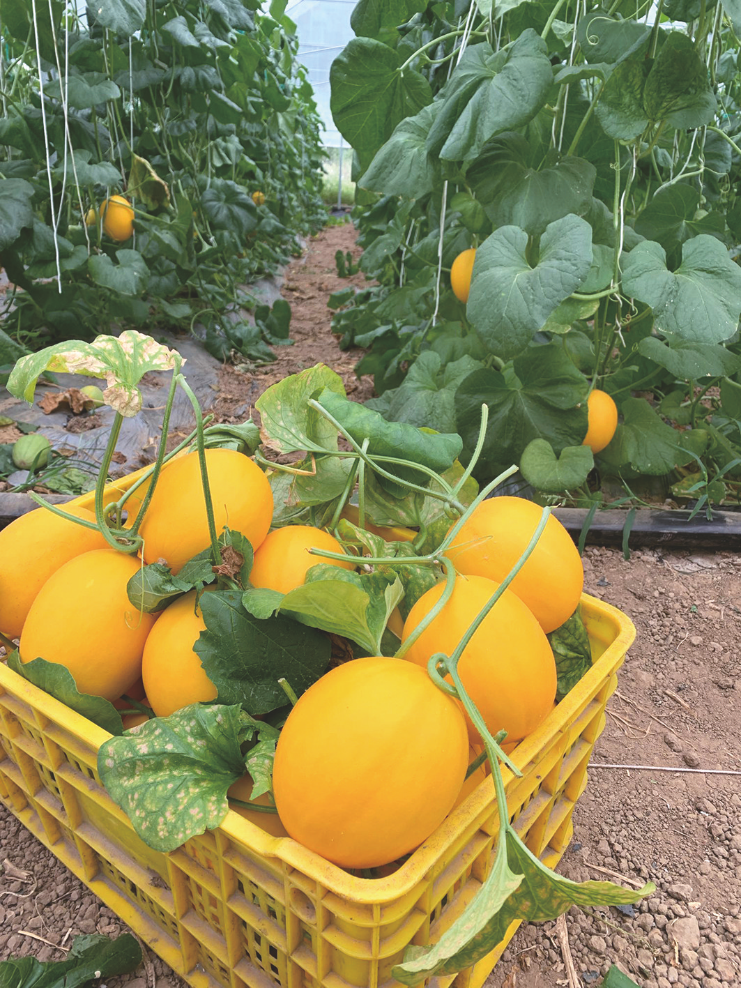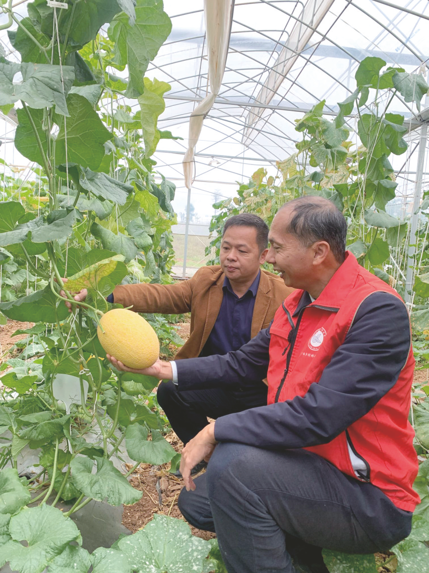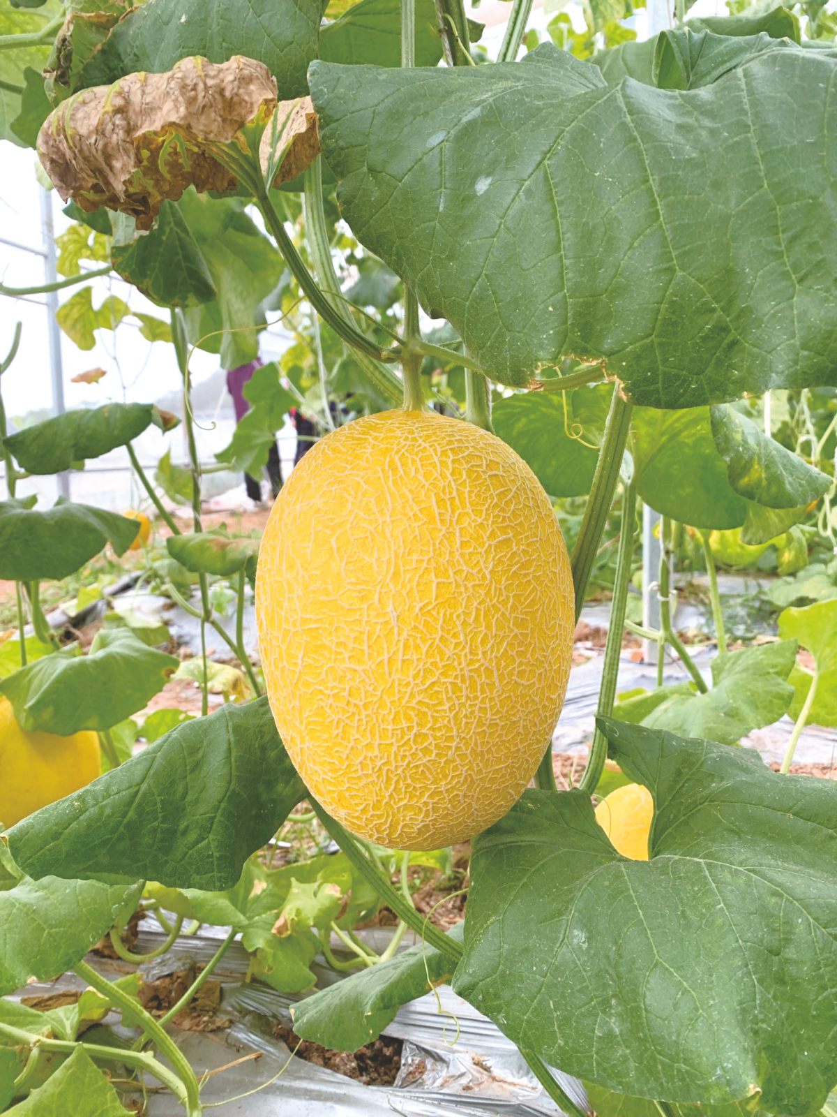 走进大棚,一排排规整的藤蔓映入眼帘,每根藤蔓的底部都悬挂着一个足球般巨细的甜瓜——黄的、绿的,光皮的、网纹的,五颜六色,令人目不暇接……“这是桂蜜12号,广西农科院的种类;这种绿绿的,看起来像橄榄球的,也是引入的新种类,俗称‘巴西蜜瓜’,又名‘斗牛士蜜瓜’,果肉是绿色的;这个种类还没有来得及取名字,只要一个编号,过几天将在展销会初次露脸,方案叫它‘南网1号’‘南网2号’,口味是软糯甜美的,带点蜂蜜的风味。”广西大学农学院副教授、广西蔬菜工业科技先锋队副队长、广西村庄科技特派员唐小付托起一个网纹甜瓜喋喋不休地说道,“在高端大型商超,一个网纹甜瓜可卖到198元。成熟后的网纹甜瓜网纹均匀立体,口感脆甜幽香,是当之无愧的‘黄金瓜’。”